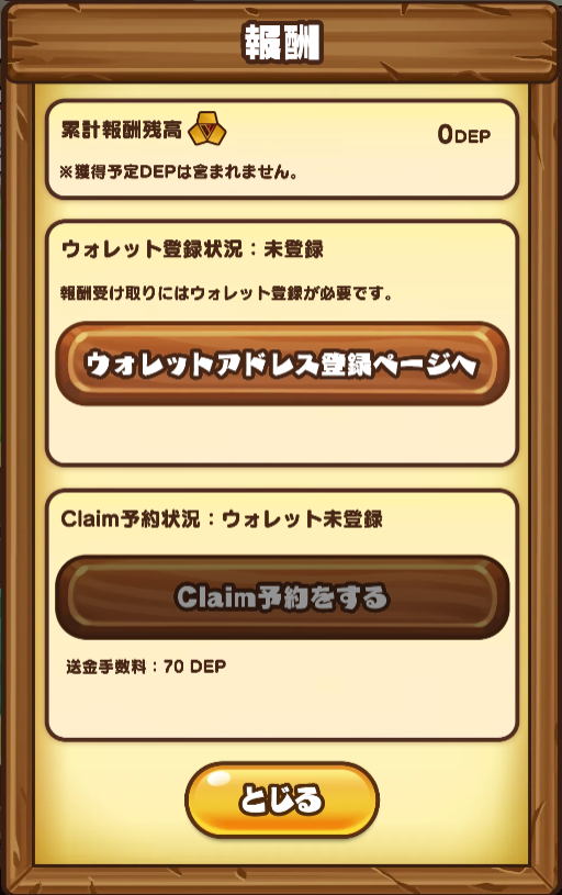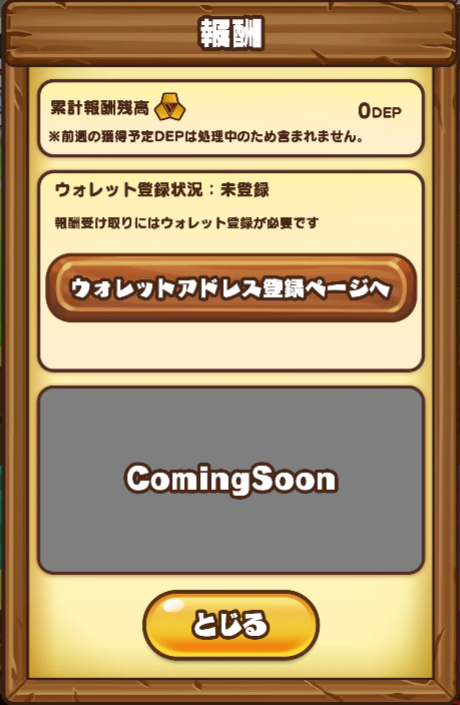 それまでに獲得したDEPはゲーム内に記録され、報酬ダイアログ内の 累計報酬残高 にて確認できます。