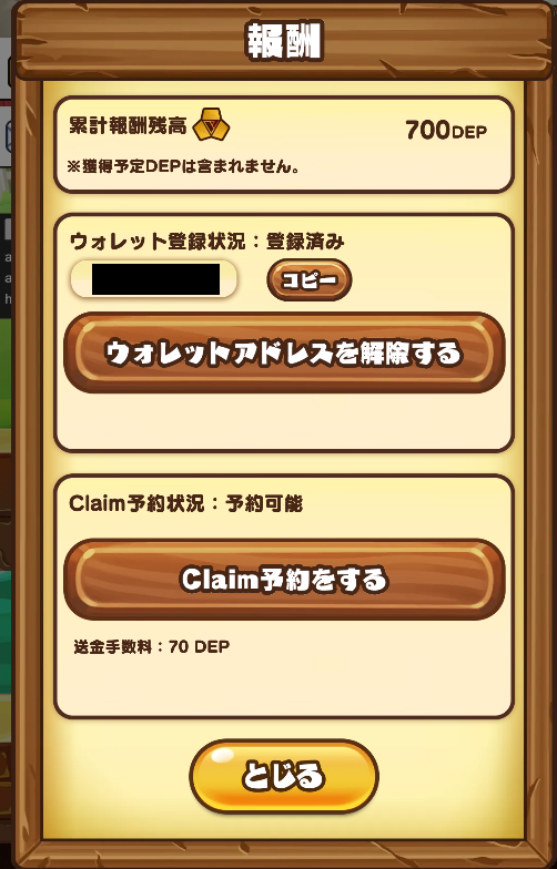 ウォレットが登録済みで、累計報酬残高が送金手数料以上の場合、「Claim予約をする」ボタンが押せるようになります。